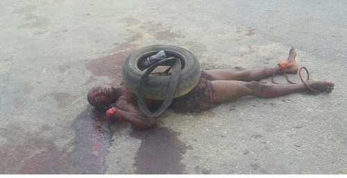 “From what you can see here, he may have been killed by angry youths who reside here. And this possibly happened this early morning because the blood and the cuts are still very fresh and from what we have seen, he was killed some distance away from here but was dragged to this junction where everybody will see”.