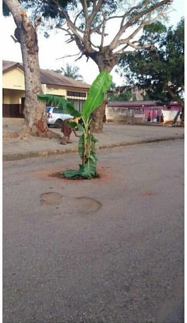 In Ghana this is the new trend, to protest against bad roads, residents plants plantain inside potholes to attract the attention of the government. Can this happen in Nigeria?